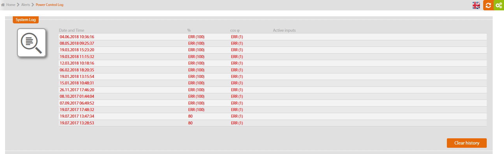 This table shows each adjustment of active and reactive power production of a PV plant. You can erase the history with a button in the right corner down.