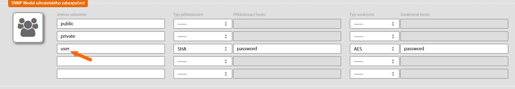 Nastavte tabulku SNMP modelu uživatelského zabezpečení. Vytvořte nového uživatele nebo nastavte zabezpečení u stávajícího uživatele.