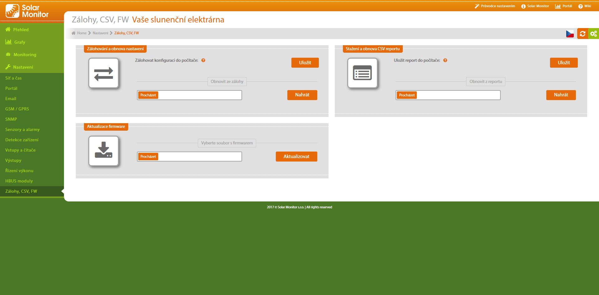 Toto menu slouží pro nahrání nové verze programového vybavení jednotky Solar Monitor. Pravidelně kontrolujte stránky www.solarmonitor.cz (v sekci Podpora/Ke stažení) pro stažení nejnovější verze firmware.