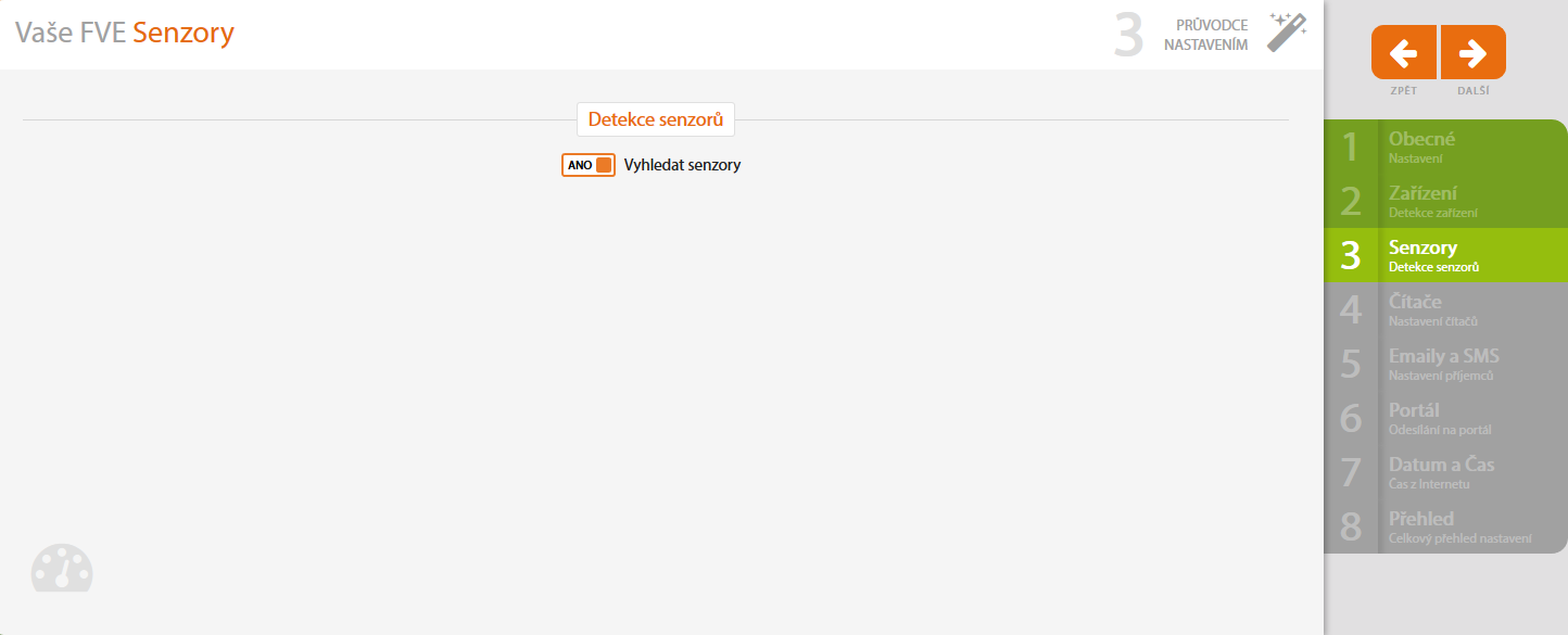 Pokud nemáte k jednotce Solar Monitor připojené žádné senzory, ponechte v políčku Vyhledat senzory volbu NE a klikněte vpravo na šipku Další.