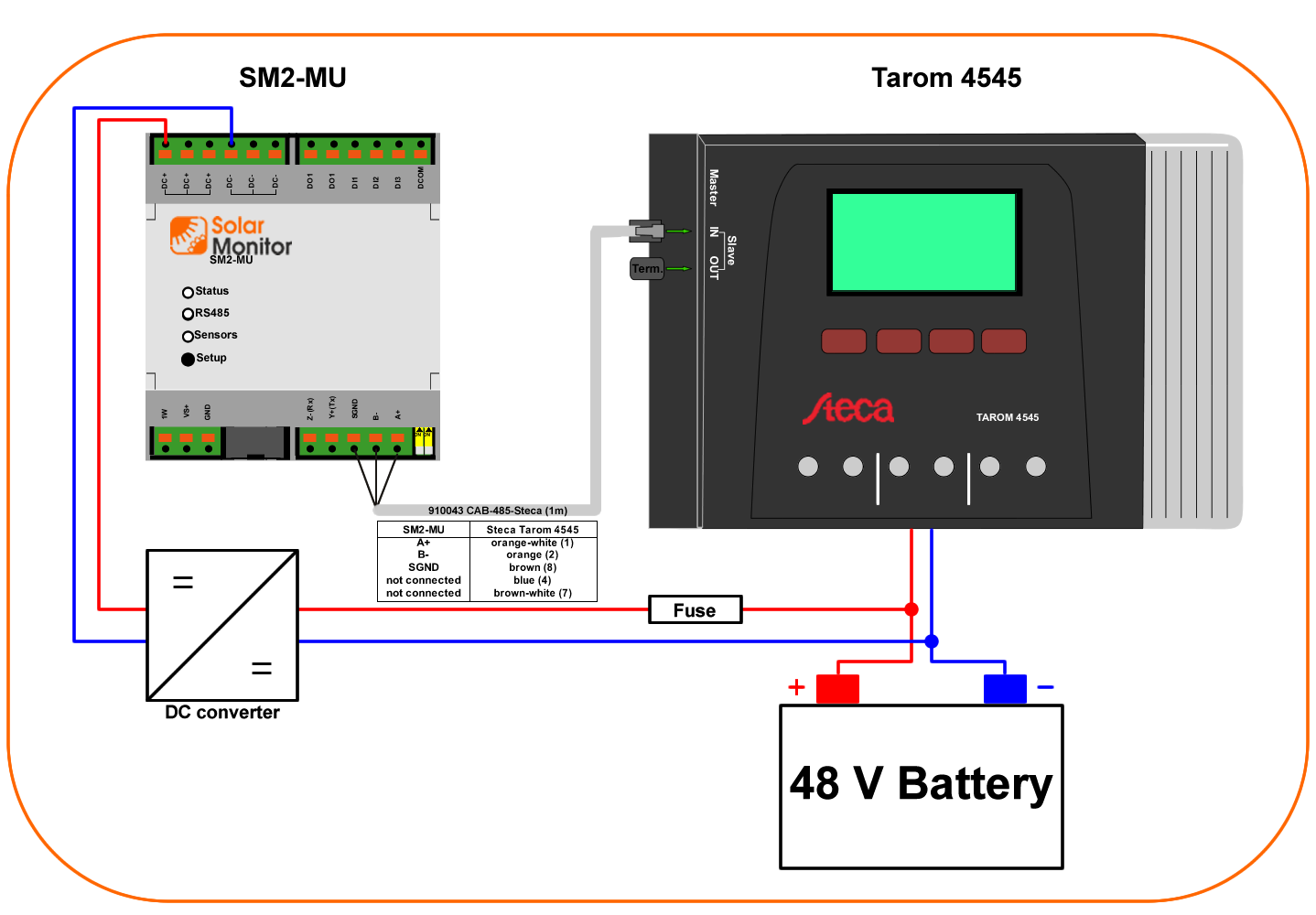 SM2-MU powered from battery 48 V which is connected to the Tarom 4545(-48)