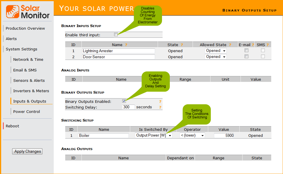 Submenu Inputs & Counters enables setting up the inputs and switching on the outputs (controlling own consumption - using surplus energy)