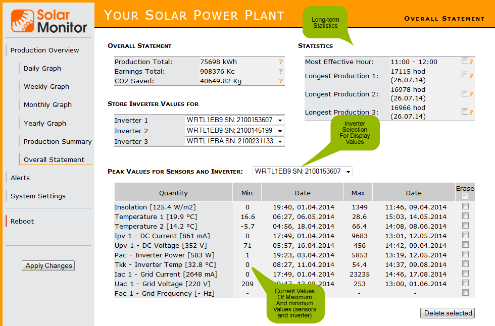 Table shows maximum and minimum values of sensors and inverter selected in sliding box at the top of the table. You can erase each line and start watching maximum and minimum values again.