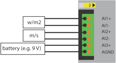 Measurement ranges are set up before module is delivered! Correct specification when you order SM2-AD module is essential. It is possible to connect pyranometer (measures solar irradiation), anemometer (measures wind speed) or battery.