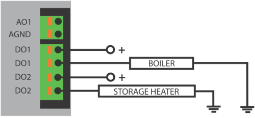 Digital (relay) outputs DO to be connected in the same way as with SM2-MU. E.g. to the boiler or storage heater as shown in the picture.