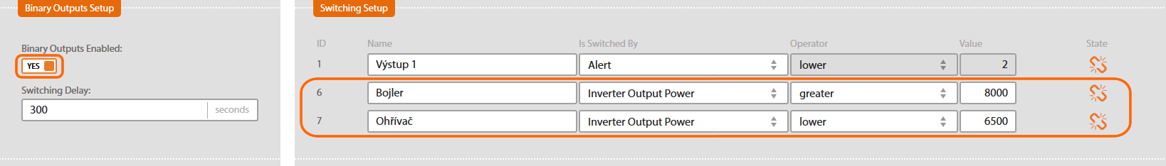 Nastavení digitálních výstupů je stejné jako pro výstup DO1 v SM2-MU. Výstupy musíme povolit a následně vybereme za jaké podmínky se výstupy budou spínat (např. od určité hodnoty výkonu).
