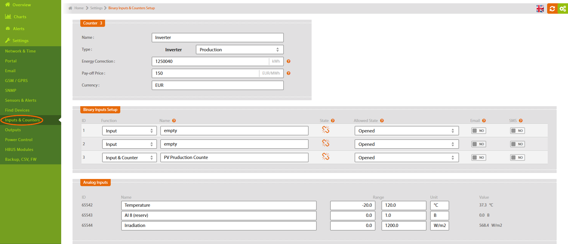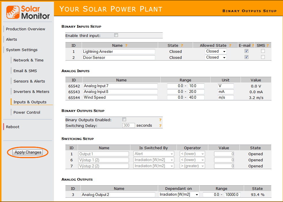Jakmile jsou moduly spojeny a k Solar Monitoru je připojen napájecí zdroj, musí svítit zelená LED dioda Status. V opačném případě zkontrolujte spojení modulu s SM2-MU. V internetovém prohlížeči si otevřete menu „Nastavení systému / Vstupy a výstupy“.