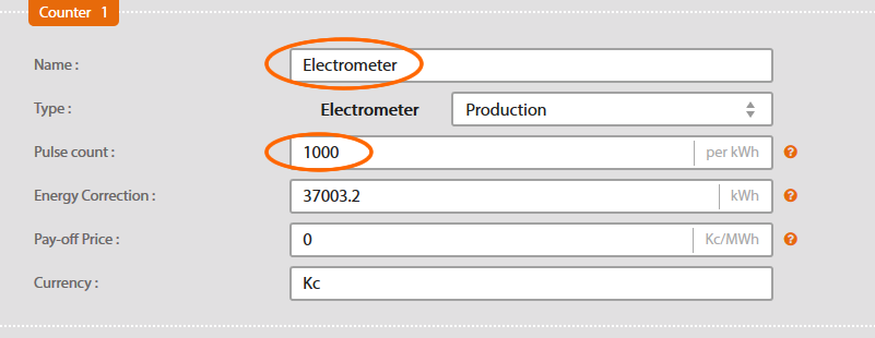 In upper part of the table there is name of the counter. Enter its name (e.g. electro meter) and select its type. Set up correct number of pulses per 1 kWh (as stated in SO output parameters at the counter).