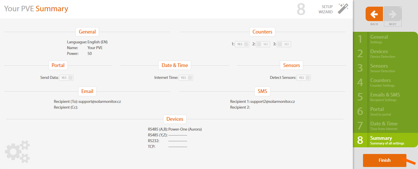 Po kliknutí na tlačítko Dokončit vyčkejte než se provede konfigurace Solar Monitoru. Délka konfigurace závisí na tom, zda jsou detekována nějaká připojená zařízení (střídače, senzory, apod.).