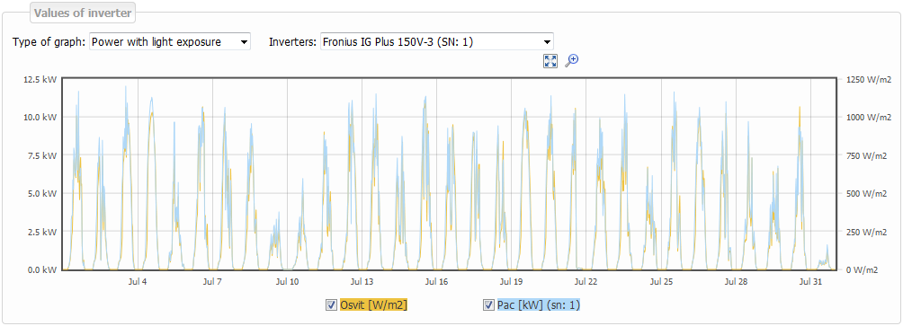 Inverter's values are shown in a line graph. In a daily graph all received data is presented ( in a given period, minimum 5 minutes). With time period longer than 2 days the data is given in arithmetical average per 30 minutes. If presented time period exceeds 30 days the data is given in arithmetical average per 24 hours.