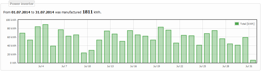 Green bars in the first graph show the energy produced. Daily graph shows the total of energy produced per hour. Monthly graph shows energy produced per day. Annual graph shows total per each month.