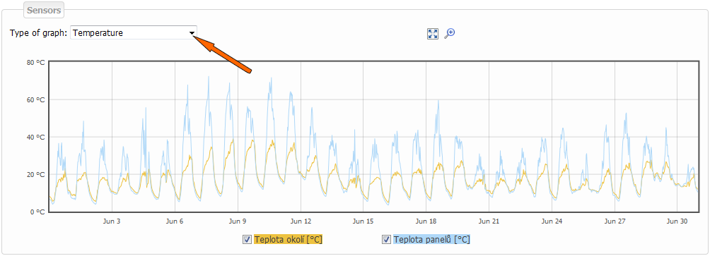 In case you use your sensors to monitor various values (temperature, wind velocity, irradiation, etc.), select the value that you want displayed in the graph. If the particular value data come from multiple sensors, all can be displayed in one graph in different colors. The units are shown on the right side of the graph.