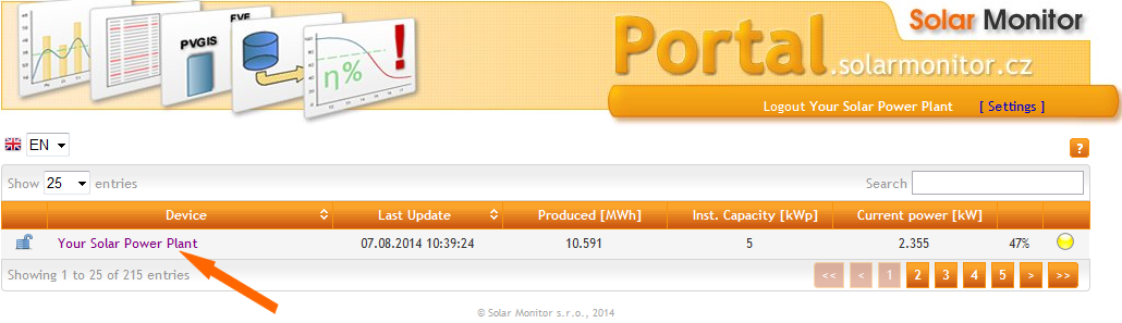 After you have logged in, the name of your PV plant's account appears. Click on the name to enter the account.