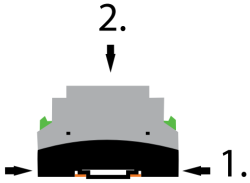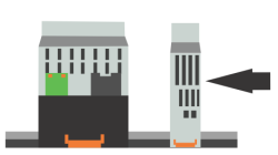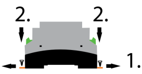 Use holes in the orange hitches to install the module on the wall. The hitches must be “opened”. To open the hitches press the safety catch with a pointed object (e.g. pen) first and then open the hitch. The same for the second hitch. Insert the screw into the holes and fasten the unit on the wall.