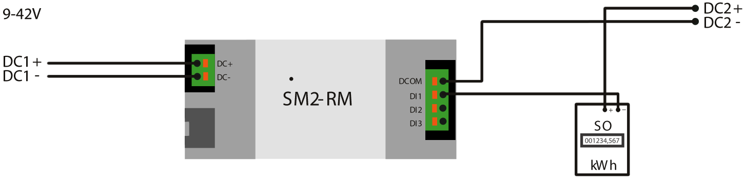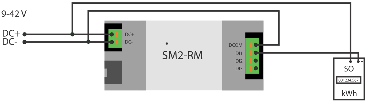 Connect SM2-RM to the meter with its S0 (pulse) output as shown in the following picture: