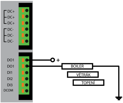 Pro využití vstupů je třeba na svorku DCOM přivést napájecí signál DC-. Pro sepnutí vstupu je třeba přivést signál DC+ na patřičnou svorku DI.