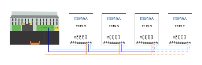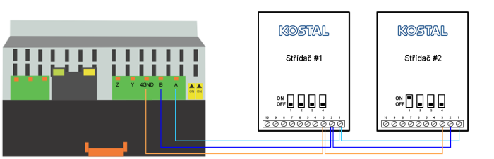 Na posledním střídači se zapne terminace posunutím přepínače DIP 1 do polohy ON.