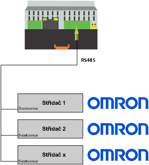 V případě zapojení více střídačů se další střídač připojí k předchozímu dle tohoto zapojení: