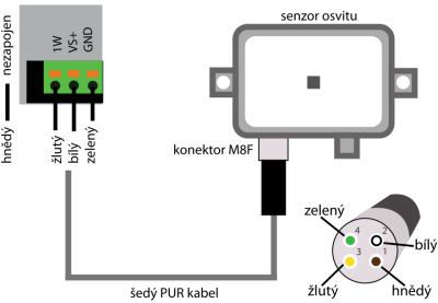 Pro vedení od SM2-MU k senzoru osvitu do vzdálenosti delší než 10 m se používá šedý PUR kabel s konektorem M8F.