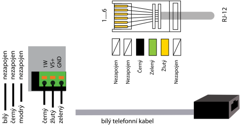 Pro vnitřní vedení se používá 6-žílový telefonní kabel a konektory RJ12. Je možné též použití UTP kabelu CAT5. Pro osazování koncovek použijte příslušné krimpovací kleště.