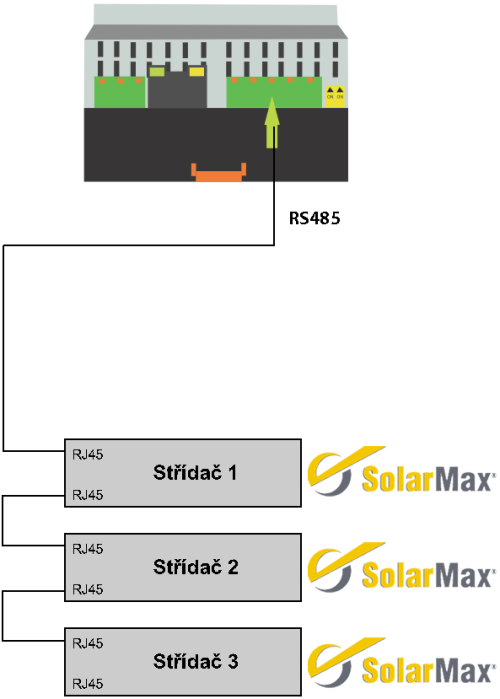 V případě zapojení více střídačů, propojte mezi sebou jednotlivé střídače rovným kabelem.