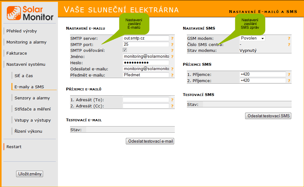 Pokud je k jednotce Solar Monitor připojen GSM modem, povolte tuto volbu.