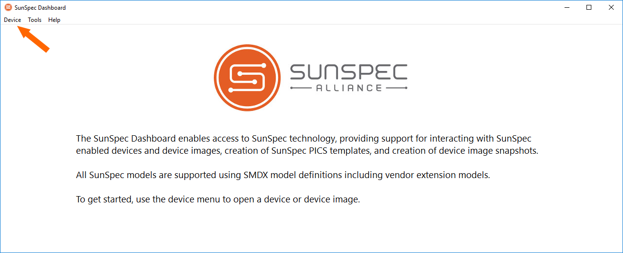V aplikaci SunSpec Dashboard klikněte na záložku Device a poté na Open.