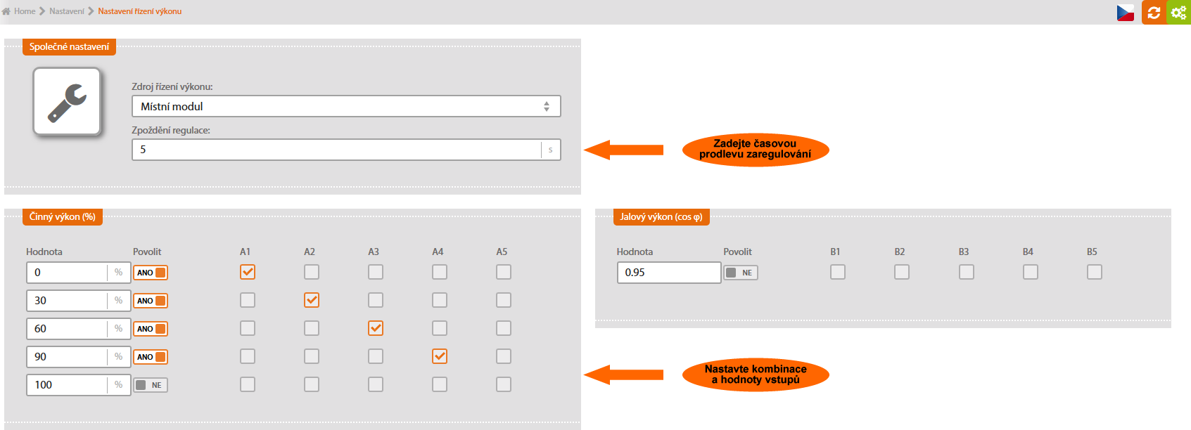Nastavte jednotlivé kombinace vstupů a jim odpovídající hodnoty řízení výkonu (cos φ).