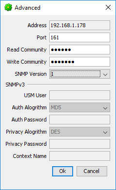 Vyplňte pole Read Community a Write Community dle nastavení v Solar Monitoru (defaultně public, private). Klikněte na OK.