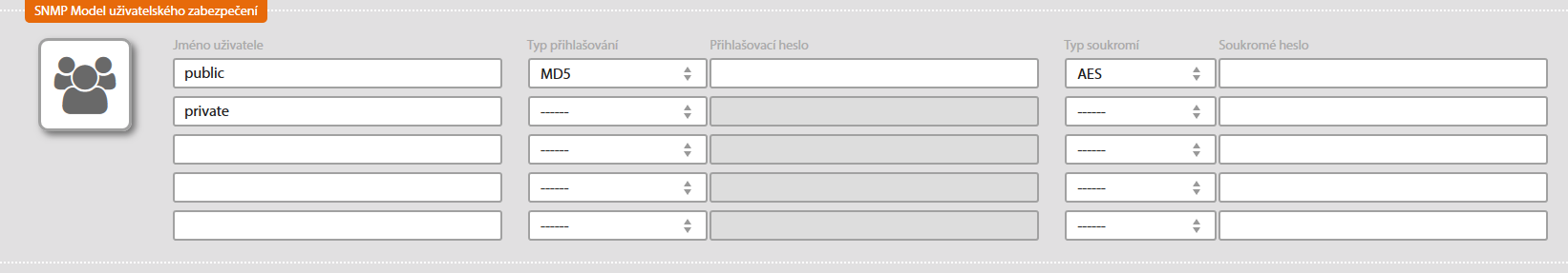 Pro SNMP Verze 3 se webové rozhraní liší v nastavení zabezpečení. Namísto nastavení SNMP Seznam komunit se zobrazí tabulka s nastavením pro SNMP model uživatelského zabezpečení.