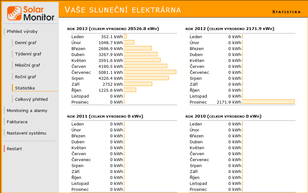 Zobrazuje vyrobenou energii po měsících za poslední 4 roky. Jedná se o jednoduchý nástroj pro porovnání výroby.