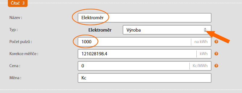 V horní části se objeví tabulka čítače. Zadejte jeho název (např. elektroměr) a vyberte typ čítače. Nastavte správný počet pulzů na 1 kWh (dle parametru výstupu S0 na čítači).