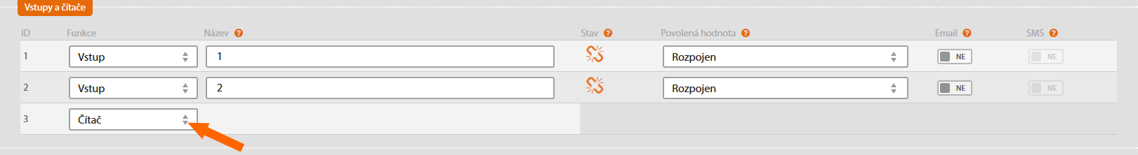 V tabulce Vstupy a čítače vyberte u toho vstupu, do kterého máte připojené měřidlo, funkci Čítač.