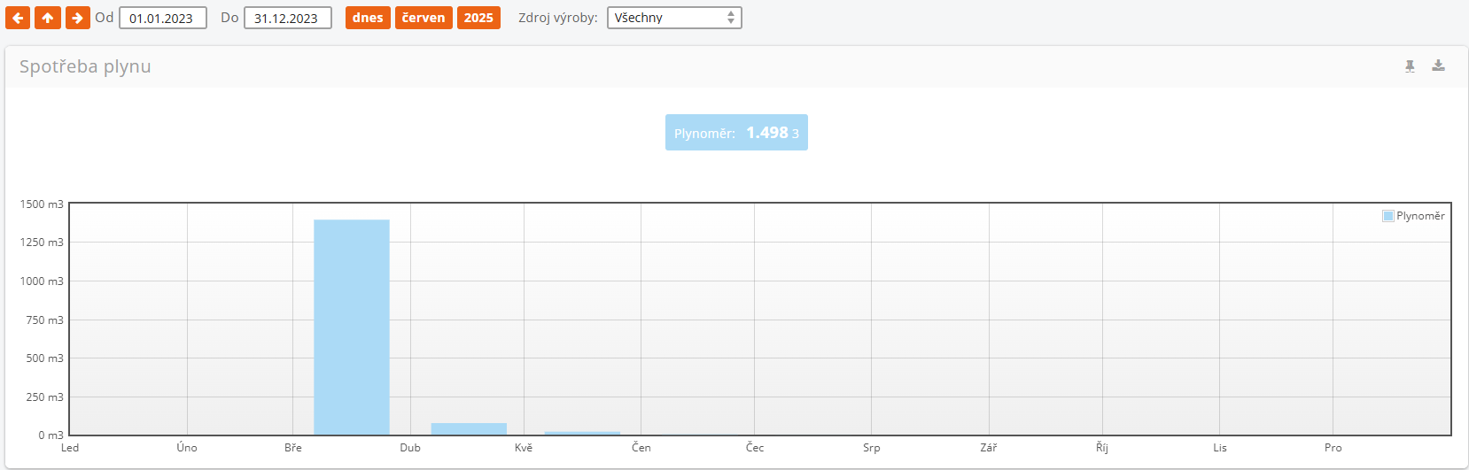 Zdroj informací o spotřebě plynu. Pokud je více plynoměrů, je možné zvolit buď zobrazení informací o spotřebě plynu z vybraného plynoměru nebo ze všech plynoměrů najednou.