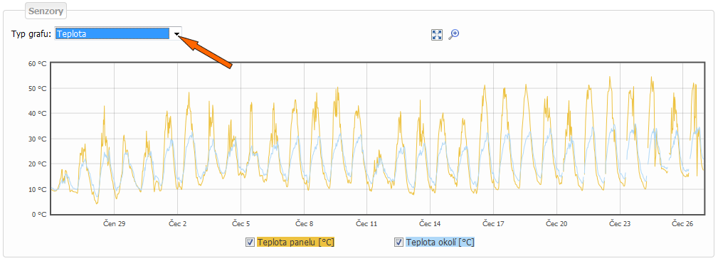 V případě, že pomocí senzorů sledujete různé veličiny (teplota, rychlost větru, osvit, atd.), vyberte, pro jakou veličinu chcete graf zobrazit. Pokud data pro danou veličinu přicházejí z více senzorů a jejich křivky se zobrazují v jednom grafu, jsou od sebe jednotlivé senzory barevně odlišeny. Jednotky pro danou veličinu jsou zobrazené na levé straně grafu.