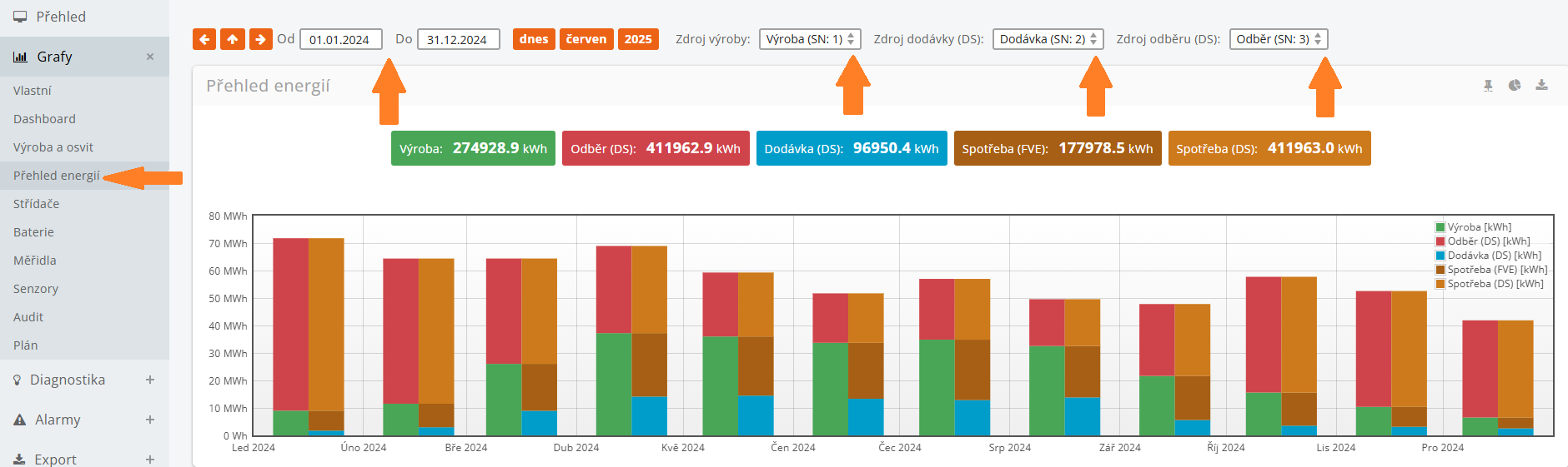 Pokud máte více zdrojů výroby, dodávky nebo odběru, nejdříve zvolte, pro jaký výrobní zdroj chcete zobrazit graf.