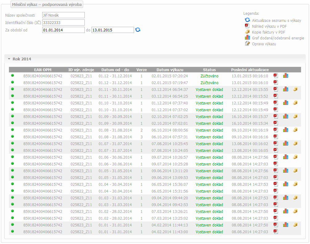 Jakmile OTE vystaví doklad o výplatě podpory, v přehledu měsíčních výkazů vpravo se zobrazí ikona