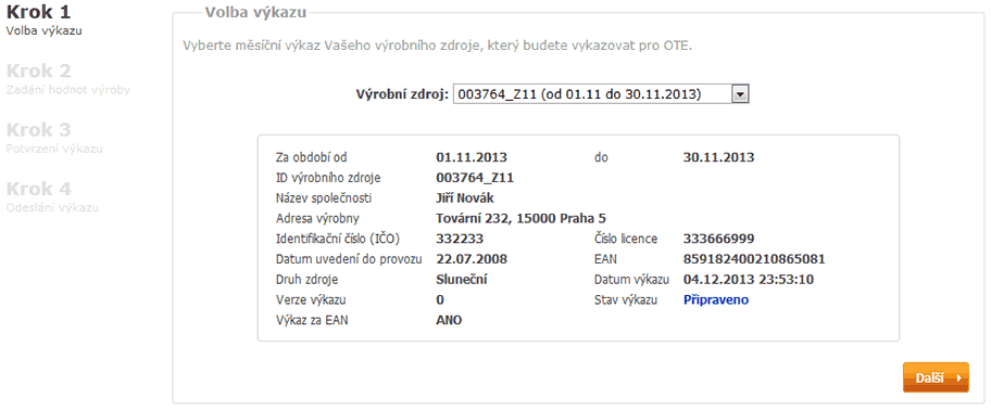 V prvním kroku se zobrazí informace o výrobním zdroji.