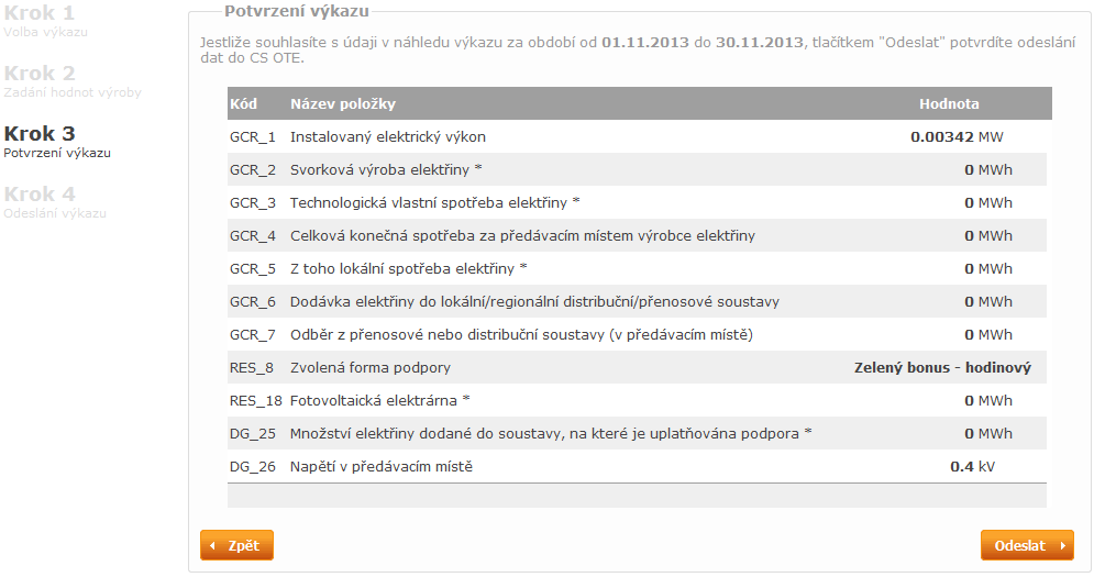ho odešlete do systému CS-OTE. V případě potřeby upravit hodnoty výkazu se vraťte tlačítkem