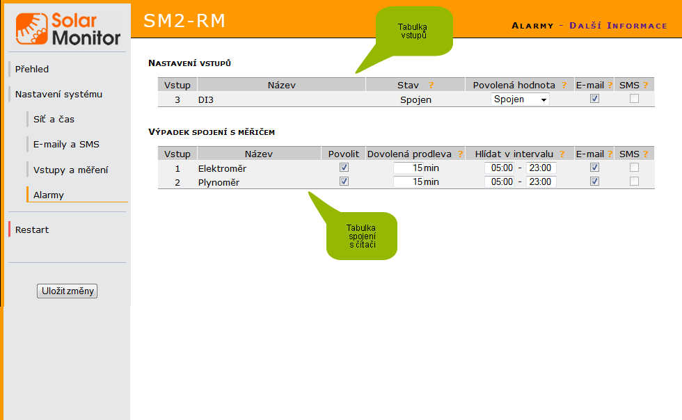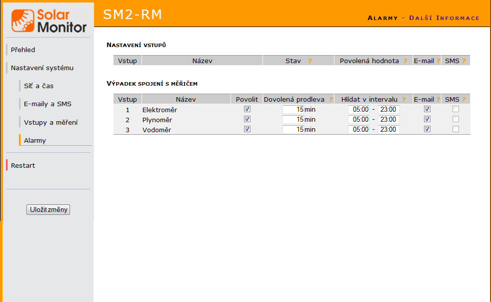 Jestliže vznikne alarm (stav vstupu má nepovolenou hodnotu nebo čítač přestane přijímat impulzy) upozornění je uživateli zasláno pouze v případě, že zaslání (emailu, sms) povolí.