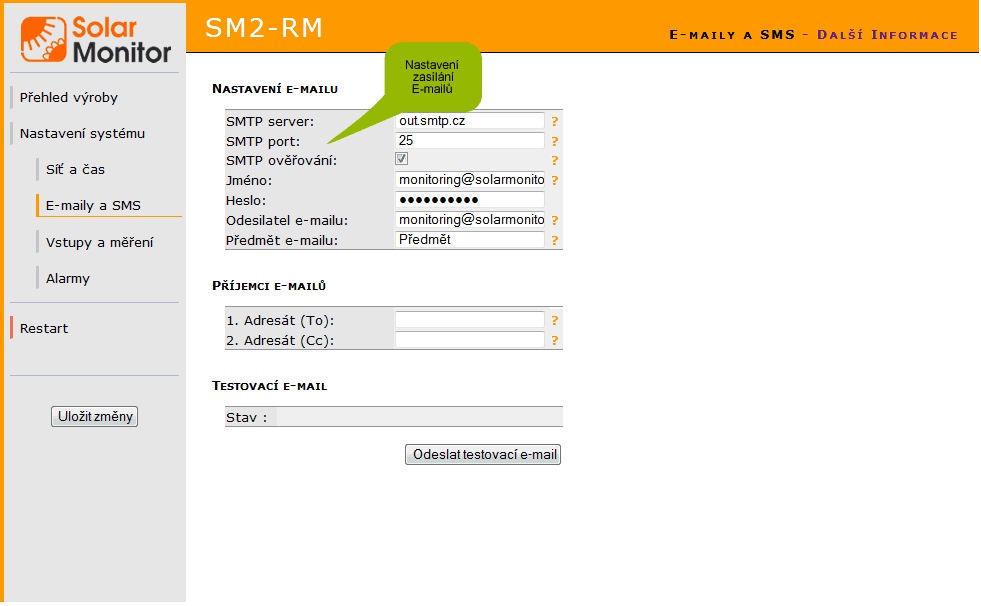 Zadejte e-mailovou adresu odesilatele (jednotky Solar Monitor). Tato adresa se příjemci zobrazí jako odesilatel.