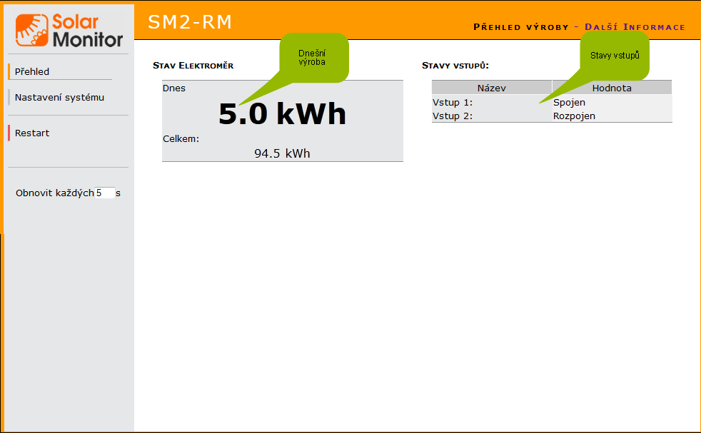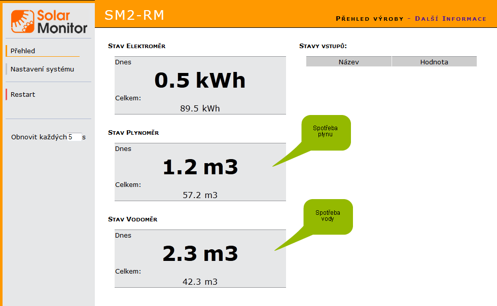 Přehled výroby slouží k získání informací z čítačů a informací o stavech vstupů.