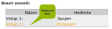 Pokud je některý ze vstupů v alarmovém stavu (než je jeho povolená hodnota), je barevně zvýrazněn: