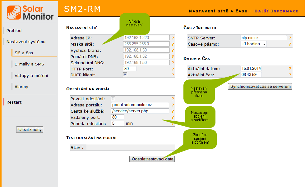 Toto podmenu slouží k nastavení sítě, času a komunikace s nadřazeným Portálem.
