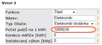 Z výroby je v zařízení nastaveno čítání pulzů z elektroměru a hodnota 1000 pulzů na 1 kWh. Změňte tuto hodnotu, pokud Váš elektroměr dává jiný počet pulzů.