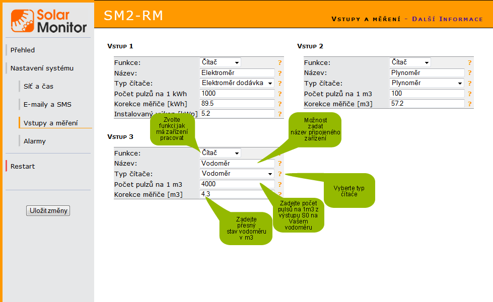 Zadejte počet pulsů na jednu jednotku (kWh, m³), které generuje Váš měřič na výstupu S0. Tuto informaci zjistíte ze štítku na čítači nebo z dokumentace k čítači. V případě zadání chybné hodnoty bude SM2-RM zobrazovat špatné údaje o výrobě nebo spotřebě.
